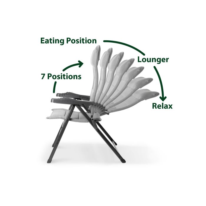 Sodoben zložljiv 4-nožni zunanji stol s 7-stopenjskim nagibnim naslonom.