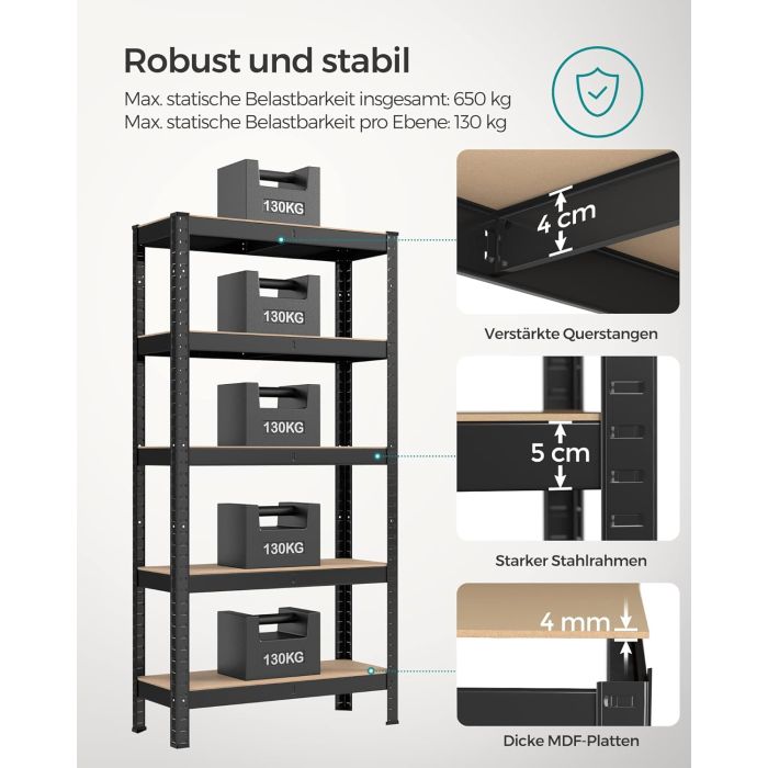 [Velika velikost, velika zmogljivost]Polica velikosti 30 x 75 x 150 cm lahko nosi do 650 kg. Polico lahko uporabite v garaži, shrambi ali kleti za organizacijo vsega orodja in opreme.